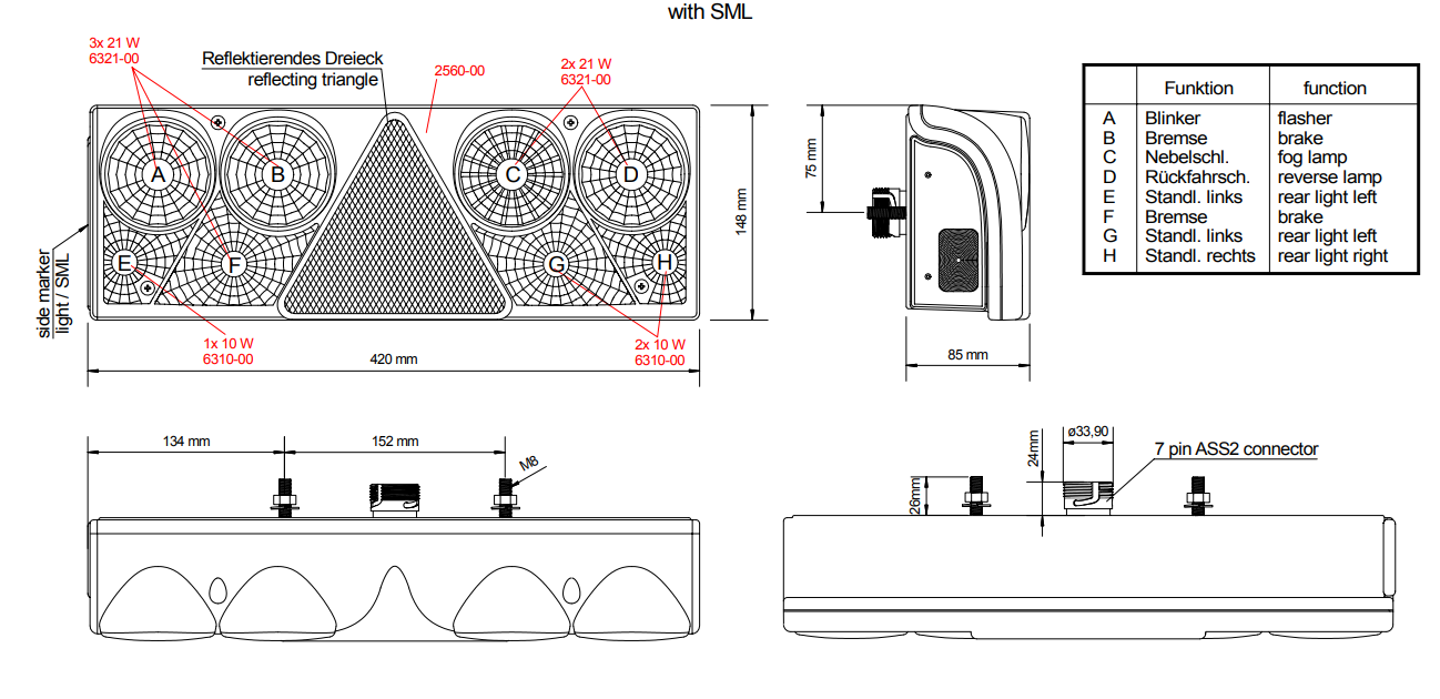 mit Rückfahrleuchte, Nebelschlussleuchte und Seitenmarkierleuchte ohne Kennzeichenleuchte