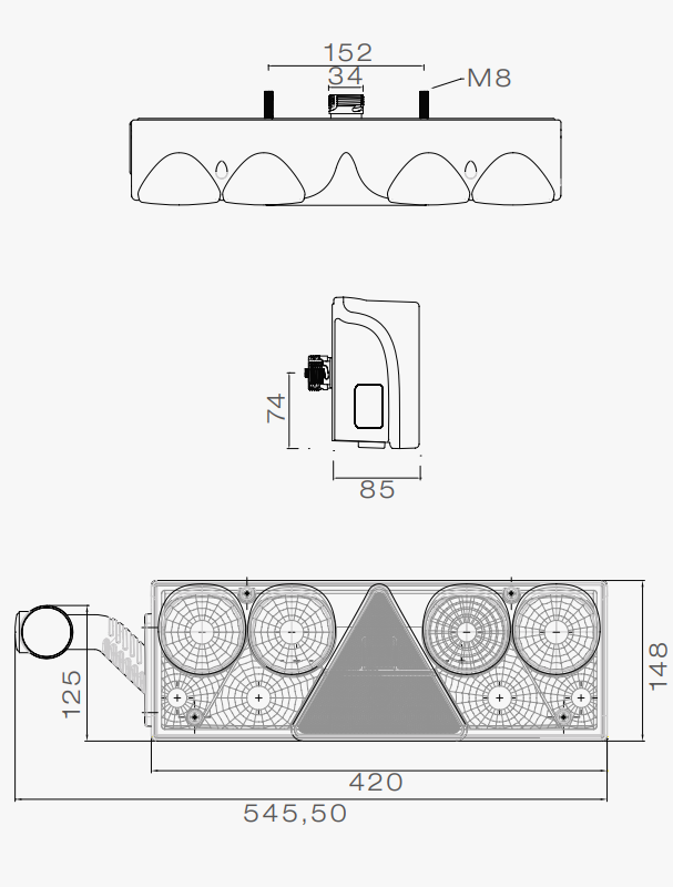 mit Rückfahrleuchte, Nebelschlussleuchte und Umrissleuchte ohne Kennzeichenleuchte unten