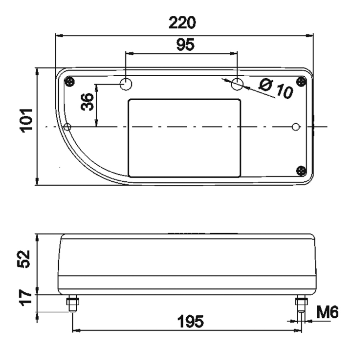 Lichtscheibe Jokon 12 V E/BBSKWN 821, rechts 220x101, mit/ohne Kennzeichenfenster-Rückfahrlicht-Nebelschlusslicht VerglNr: 014000836, 19.0068.121