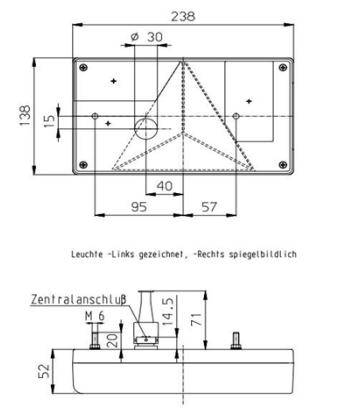Lichtscheibe rechts Blink-Brems-Schlusslicht mit Nebelschlusslichtmit/ohne Kennzeichenfensterpassend zu 102070020,...060,...120,...160Länge: 238mmBreite: 138mmE-Nummer: E2-1281