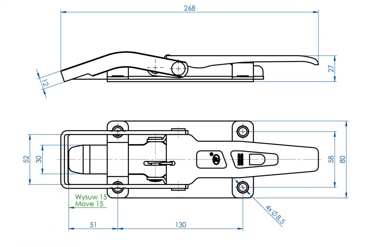 Verschluss mit Bügel + Nase Zungenverschluss, 80 x 275 mm, Platte 80 x 150 mm, Lochabstand 60/130 mm